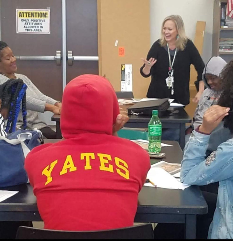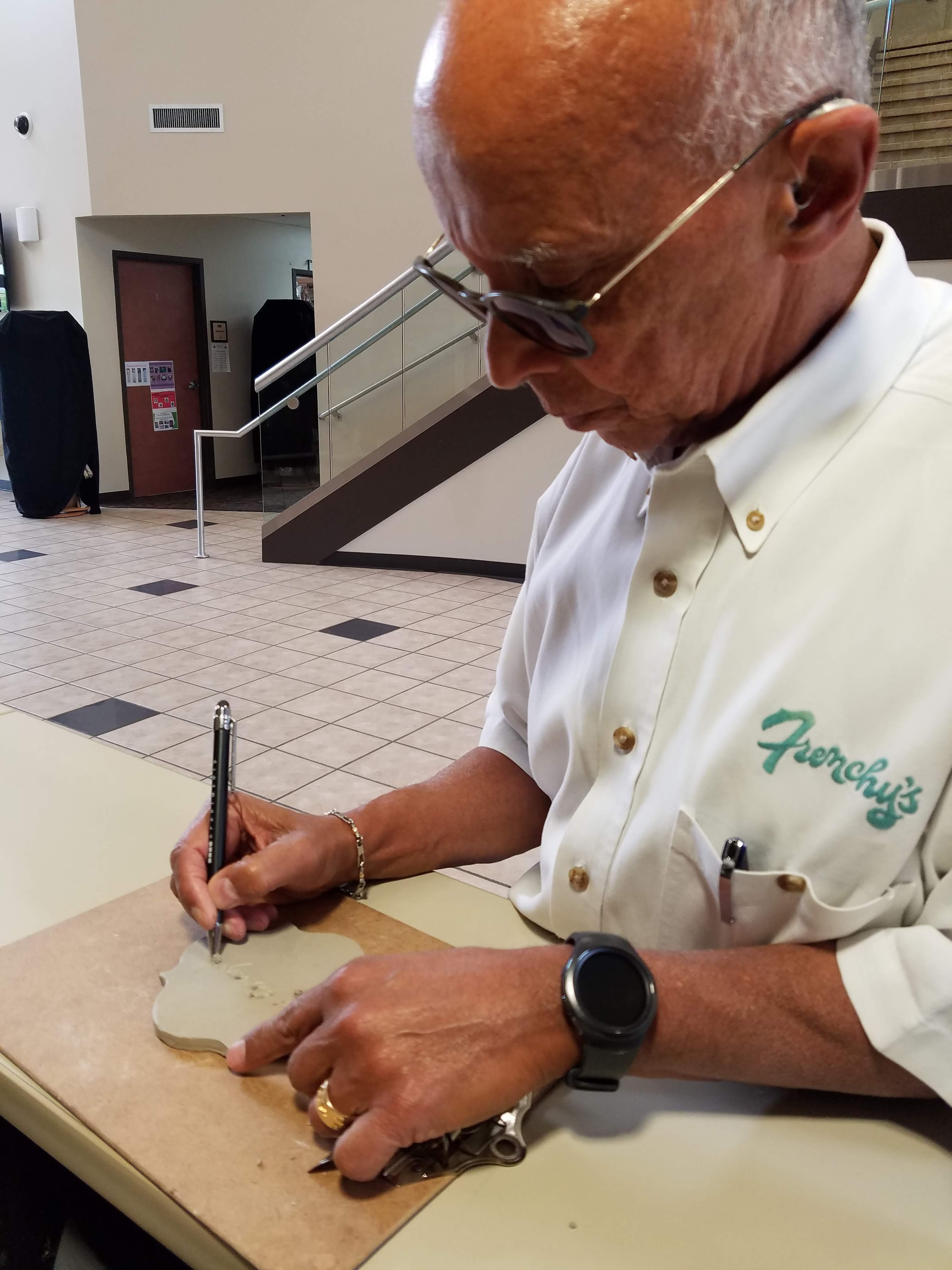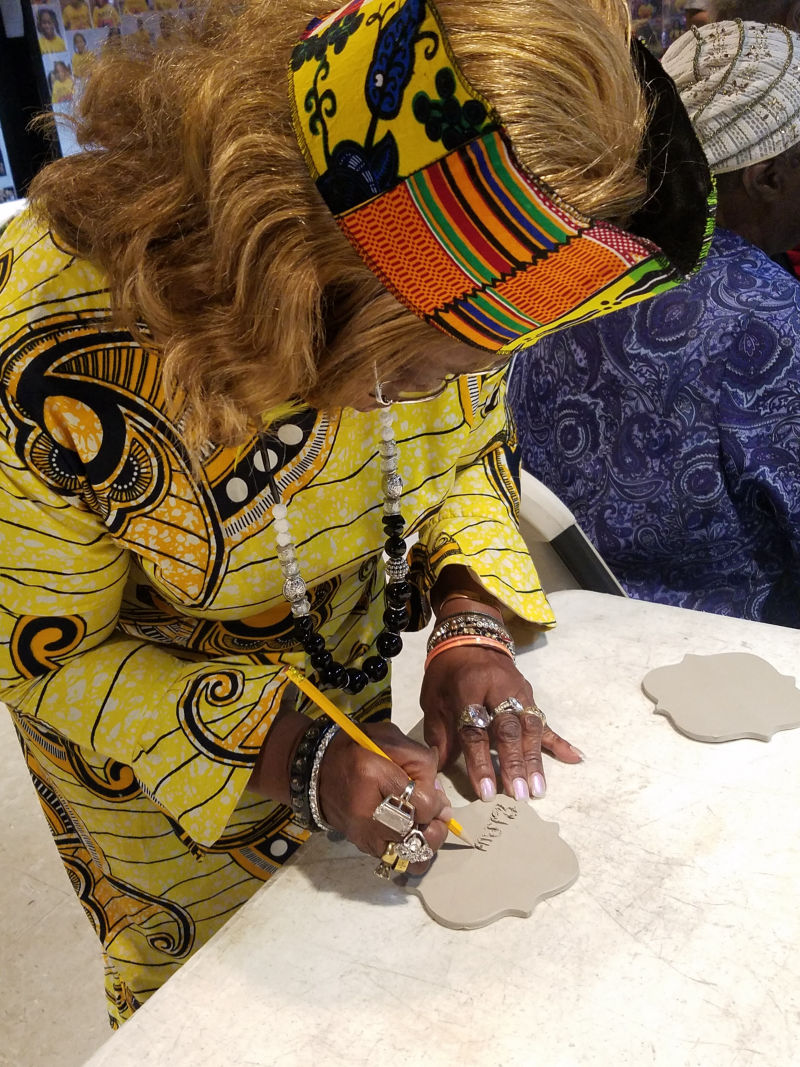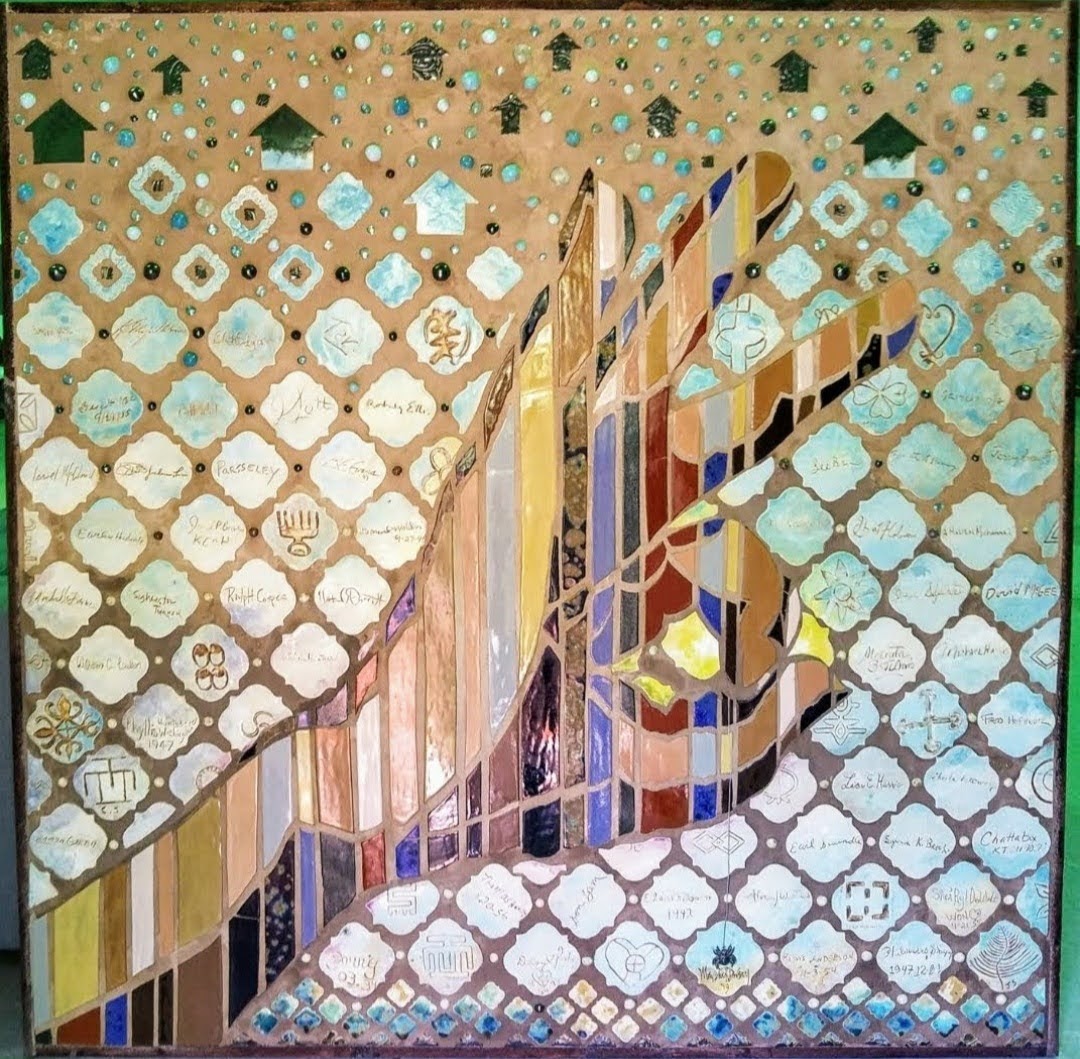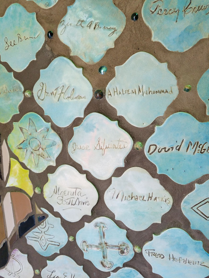 Presented to SHAPE Community Center upon its 50th anniversary, it bears the signatures of community elders and standard bearers of politics, social justice and in the arts, all floating within the chain link motif. Discussions and drawing about community and cultural identities took place at Yellowstone Academy and Yates High School, along with tile fabrication.