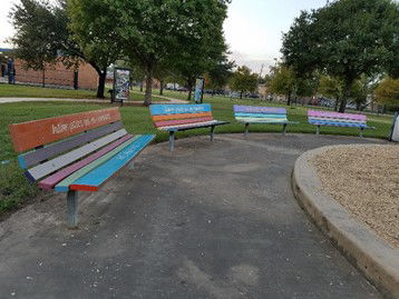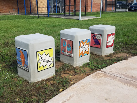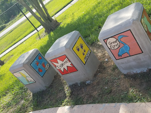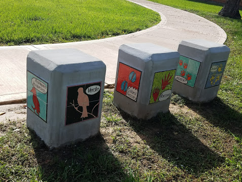 Six concrete seats along the jogging trail bear silhouettes and footprints of animals native to Texas lands.
