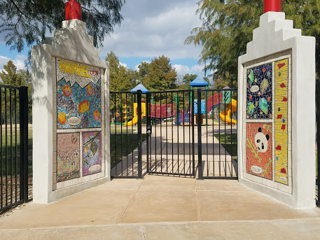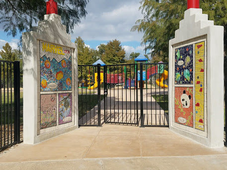 SPARK Park Entry Gate is an open comic book, bearing mosaics that highlight adventures in biology, ecology, botany and zoology.